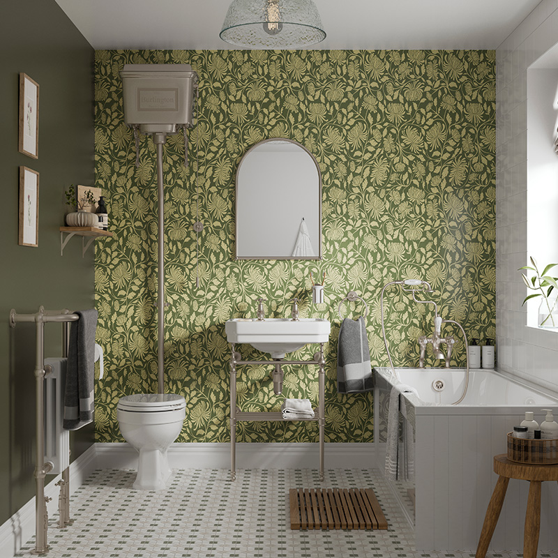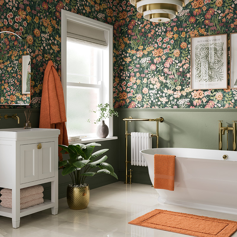 Combining the glamour of the 1920s Art Deco style with the calming, natural aesthetic of greens and floral patterns, this colourful bathroom design brings positivity and serenity to the space. Bringing a beautiful forest green into your space creates a welcoming connection with nature that, in turn, creates a soothing, calming and grounding atmosphere, making it the perfect shade for a bathroom sanctuary. The supporting colours you choose can elevate the space by adding elegance and warmth or allowing the green to pop. Opting for a Gold highlight throughout your bathroom, from taps to radiators and accessories, adds a bright, shimmering contrast against the green walls. Combining colours, such as Gold and orange, with the natural connotations of green brings the warm and welcoming appeal of a golden sunset, enhancing the atmosphere and creating a peaceful space. To complement this colour scheme, opt for white furniture, ceramics and accents to brighten up the room and allow the focal colours to shine.  |