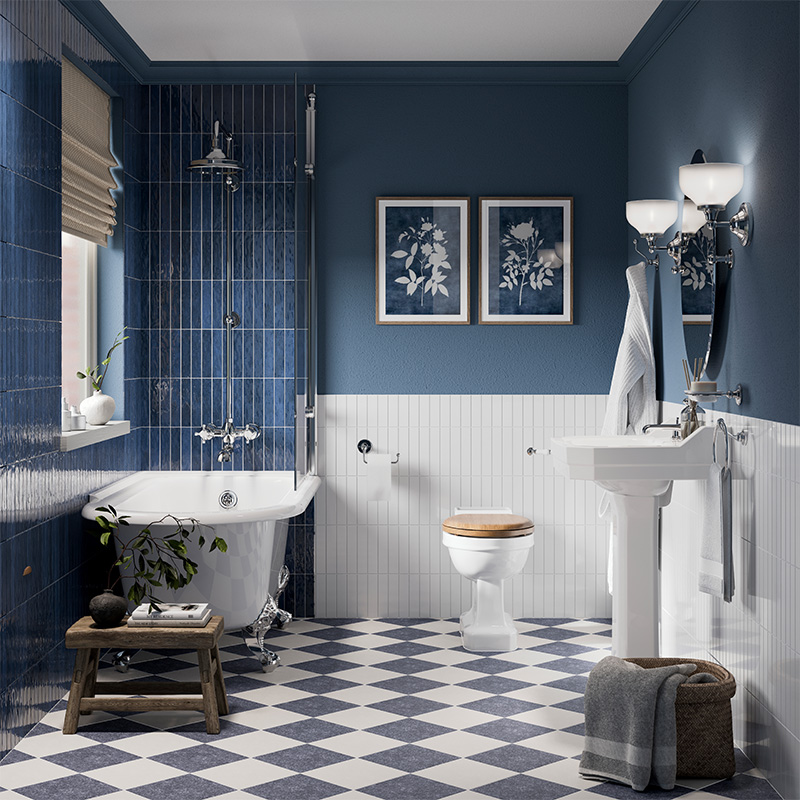 Cool colours offer a calming and serene atmosphere, making them perfect for creating a tranquil bathroom space where relaxation is at the forefront. This deep blue is a great example, achieving an instantly peaceful aura. While in modern spaces, this blue may appear dated, combining it with Edwardian aesthetics turns it into a timeless, regal and elegant hue, ideal for traditional interiors. To achieve this Edwardian look, start with a rolltop bath with decorative feet. This corner bath combines the beauty of a freestanding bath with modern bathing rituals, allowing for a shower to be included. Traditional ceramics, such as a full pedestal basin and a classically styled toilet, extend the Edwardian style out to the whole bathroom, with each main feature adding elegance and sophistication. Complete the look with era-inspired wall sconces and accessories to bring the traditional charm to every interaction.  |
