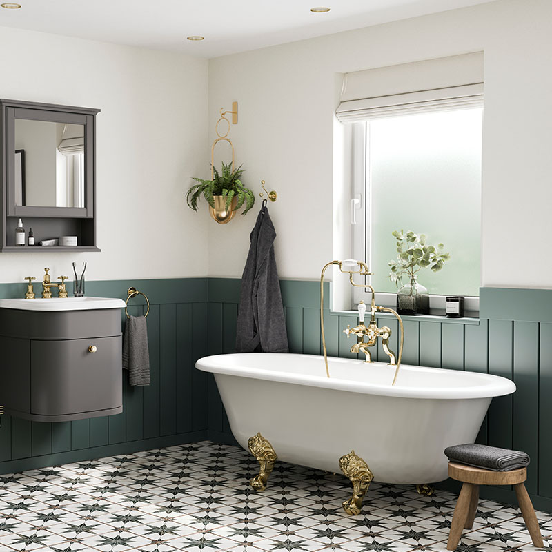 Creating a modern traditional design means blending traditional features with modern designs. This bathroom design uses elegant classical elements alongside modern trends, such as wall panelling and spa-like décor, to achieve a glamorous outcome. To achieve a luxurious traditional aesthetic, a great place to start is with a freestanding bath. This type of bath screams classical relaxation with its opulent connotations and freestanding elegance. Elevate your freestanding bath with our range of bath feet designs, each inspired by decorative designs of the past. Complete the set-up with a traditional bath shower mixer, featuring two classical crosshead tap handles and a statement hand shower. Bringing the modern and the traditional styles together is our Chalfont furniture unit. Featuring a contemporary design with classical simplicity, Chalfont furniture is perfect for any modern traditional bathroom design. Its deep drawer is ideal for storing your bathroom essentials and keeping the space looking refined. With huge savings available in The Big Bathroom Sale, replicate this bathroom design for only £2,832 – was £4,322. Sale ends 16th November. |